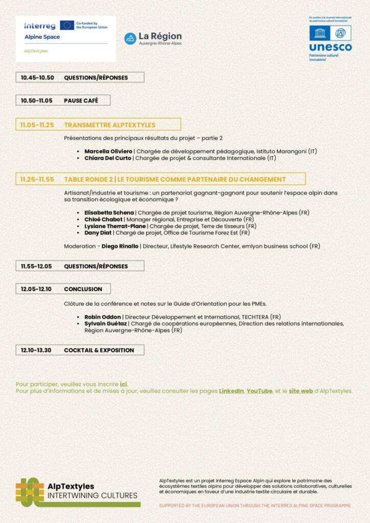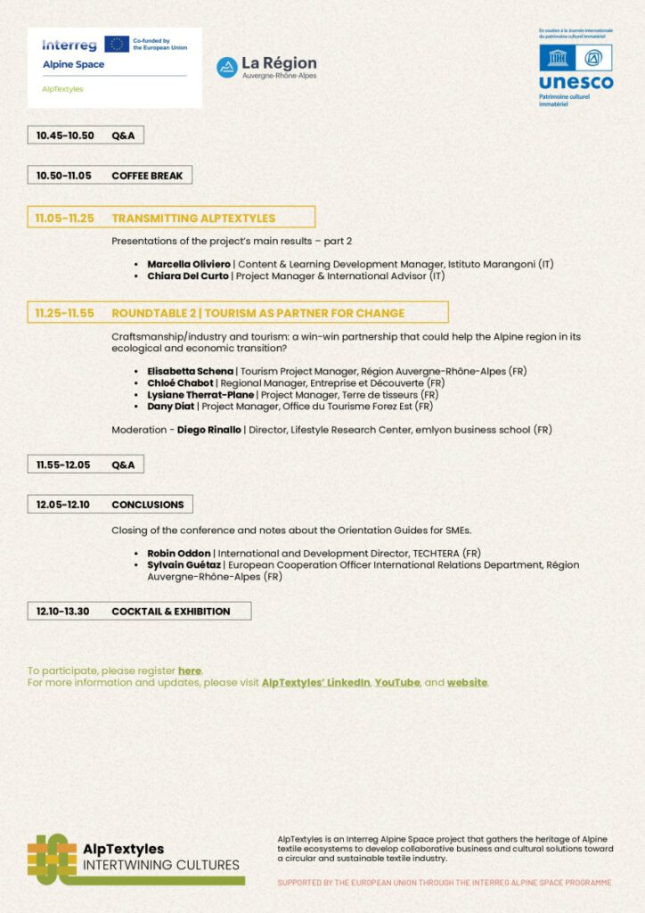 Alongside the debates, we will present the full AlpTextyles Living Exhibition with a new banner with results from our pilots and the new Safeguarding Toolkits for heritage communities and Orientation Guide for SMEs — and, of course, the many everyday objects and fashion items made with our cross-border fabric and natural dyes.