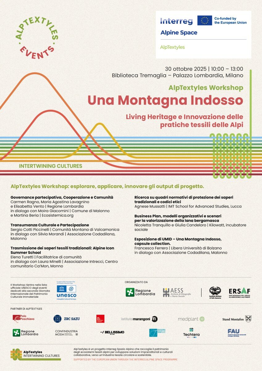 The Workshop is conceived and organized by project partner Regione Lombardia as an opportunity to explore, apply, and innovate Alpine textile practices, bridging Living Heritage and contemporary design.
