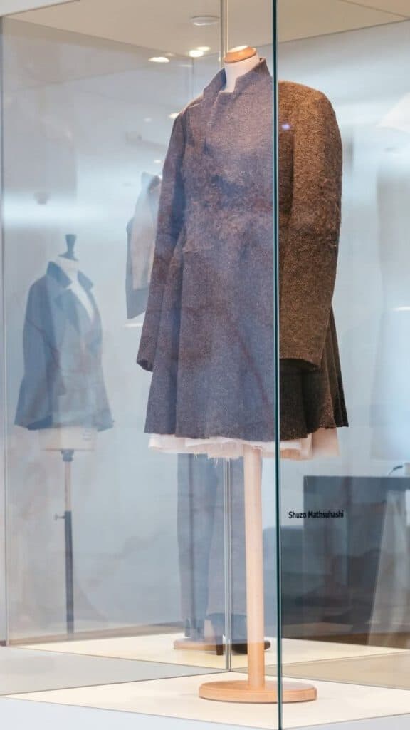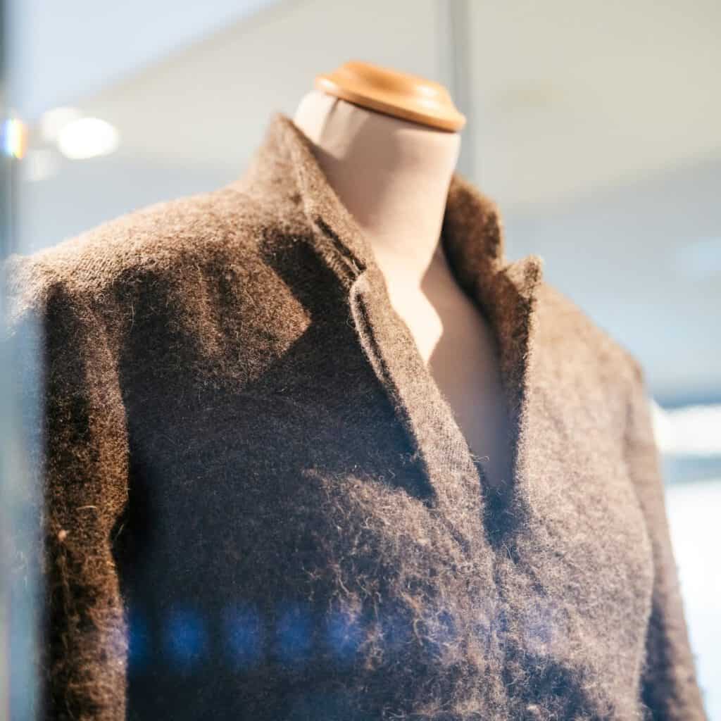 This garment transforms a structured coat into a fluid knitted dress — a symbolic shift that mirrors the journey of Montafoner wool itself: from heritage to reinvention. Designed by Shuzo Matsuhashi, the piece was created using Montafoner Tweed, a textile developed specifically for AlpTextyles by blending 50% Montafon Stone Sheep wool with wool from the Vorarlberg-based company Schöller. The fabric is woven in Höchst by Übelhör and spun and washed regionally in Tyrol, Austria — an entirely Alpine and chemical-free production chain rooted in sustainability and local craft.