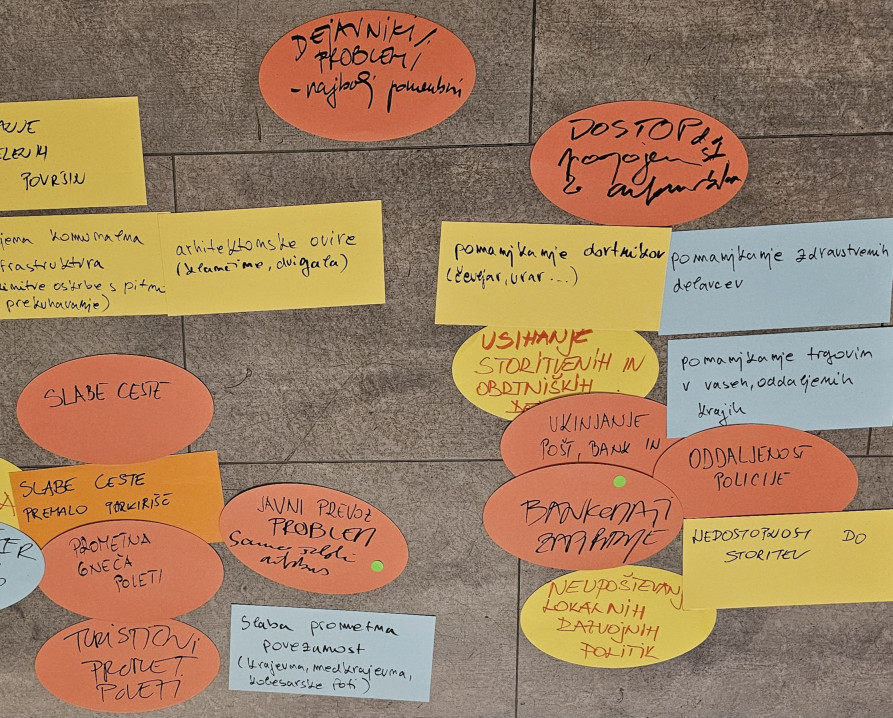 Additional thematic areas were explored in Jesenice, including transport-related challenges such as traffic culture and mobility options for the elderly, as well as spatial issues such as the shortage of housing and green spaces. In Črna na Koroškem, discussions focused on demographic trends, economic development constraints, and governance challenges, including uneven regional development, a lack of skilled personnel, and limited citizen participation.