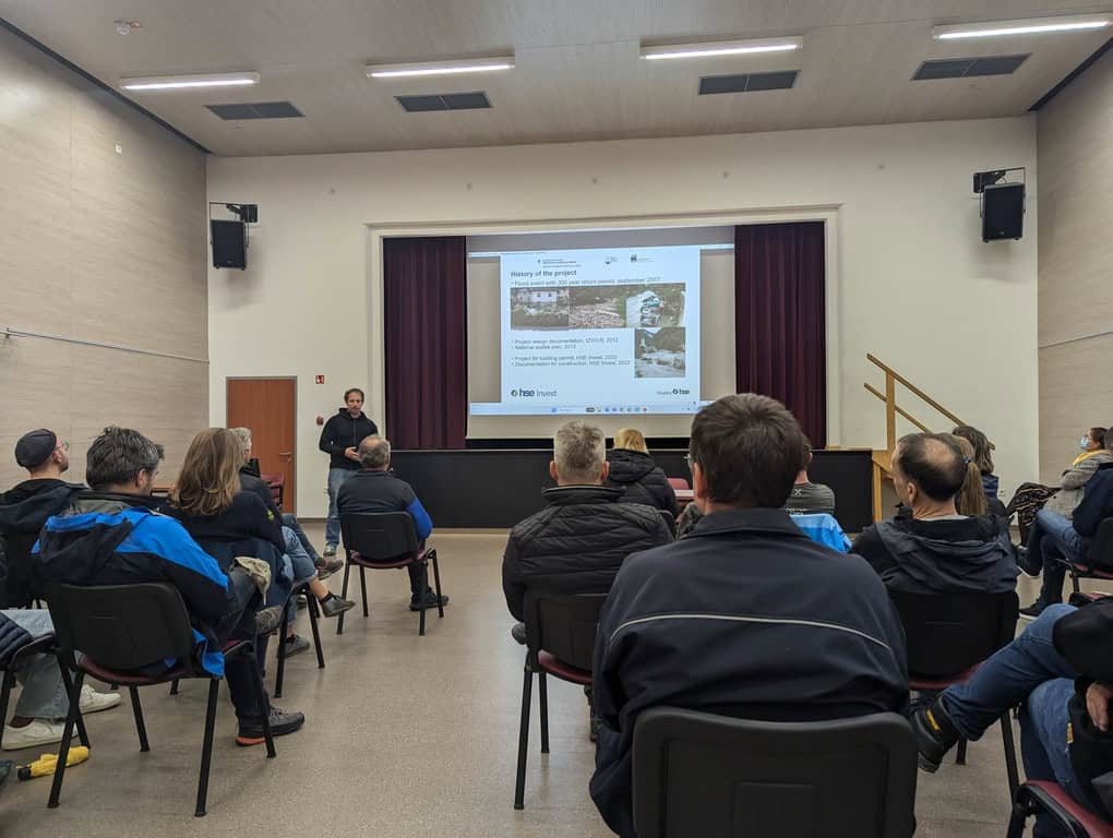 The meeting concluded with a visit to Železniki, where representatives from the Slovenian Water Agency, project designers, and the construction site manager gave an overview of the flood protection project. The construction of a dry reservoir in Železniki is a critical step toward improving flood resilience in the region.