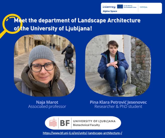 Within the Biotechnical Faculty of the University of Ljubljana, Naja Marot is an associated professor teaching regional planning and territorial governance and doing research in policy analysis; and Pina Klara Petrović Jesenovec is a researcher in the Department of Landscape Architecture, as well as being a PhD student of geography. Naja Marot was leading the expert group in charge of the preparation of the 10th Report on the State of the Alps published in 2025, from which the idea of the GOVQoL project stems as a way of bringing the report’s recommendations concerning governance to practice on the local level.
