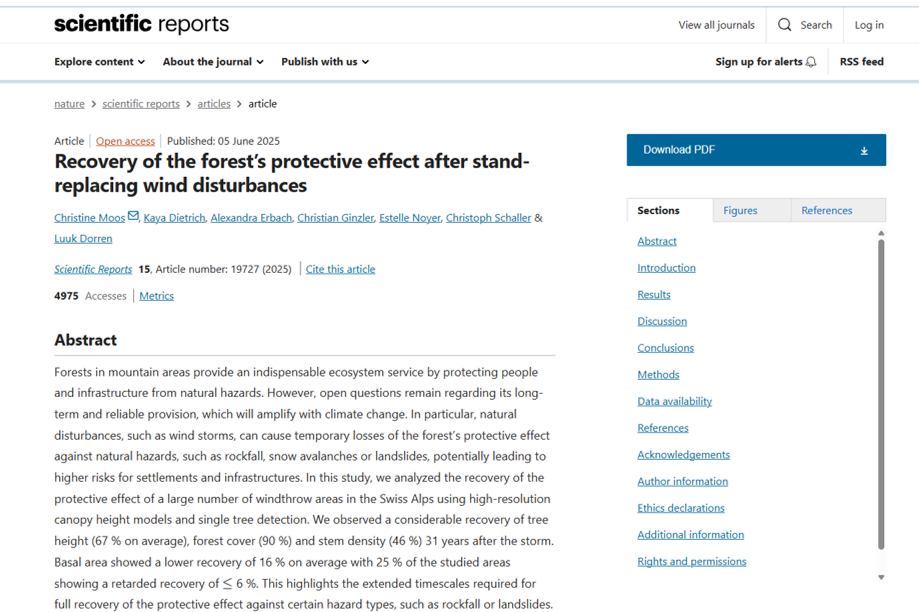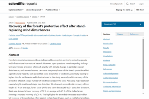 Our Swiss partners (BFH-HAFL and WSL) have published an article in Scientific Reports, an open-access scientific journal from Nature Portfolio: Moos, C., Dietrich, K., Erbach, A. et al. Recovery of the forest’s protective effect after stand-replacing wind disturbances. Sci Rep 15, 19727 (2025). To date, this article has been viewed 4,975 times.