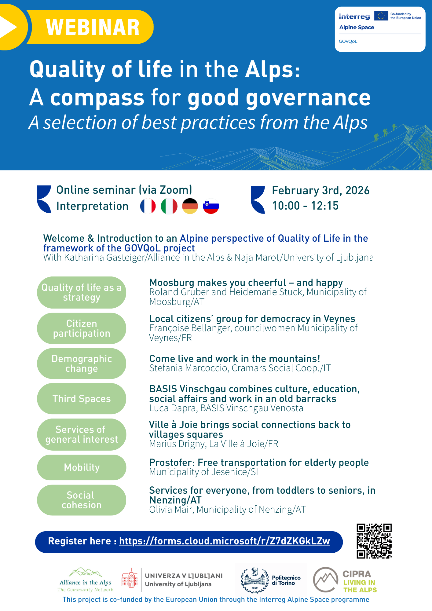 This seminar will be an introduction to how the topic of quality of life can be a compass for a healthy governance in mountain municipalities. Several good practices from different Alpines countries will be presented by municipalities themselves to show how they addressed this challenge. Services of general interest, citizen involvement, mobility, demographic change … Any local issue has a governance component to it and we will discover some ways of doing so together, during this seminar. Please find the agenda in attachment.